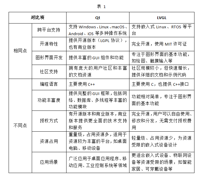 Qt和LVGL在跨平台支持和开源特性上有相似之处,但在目标平台、资源占用、编程语言、功能丰富度、授权方式和应用场景等方面存在明显差异,具体如下。