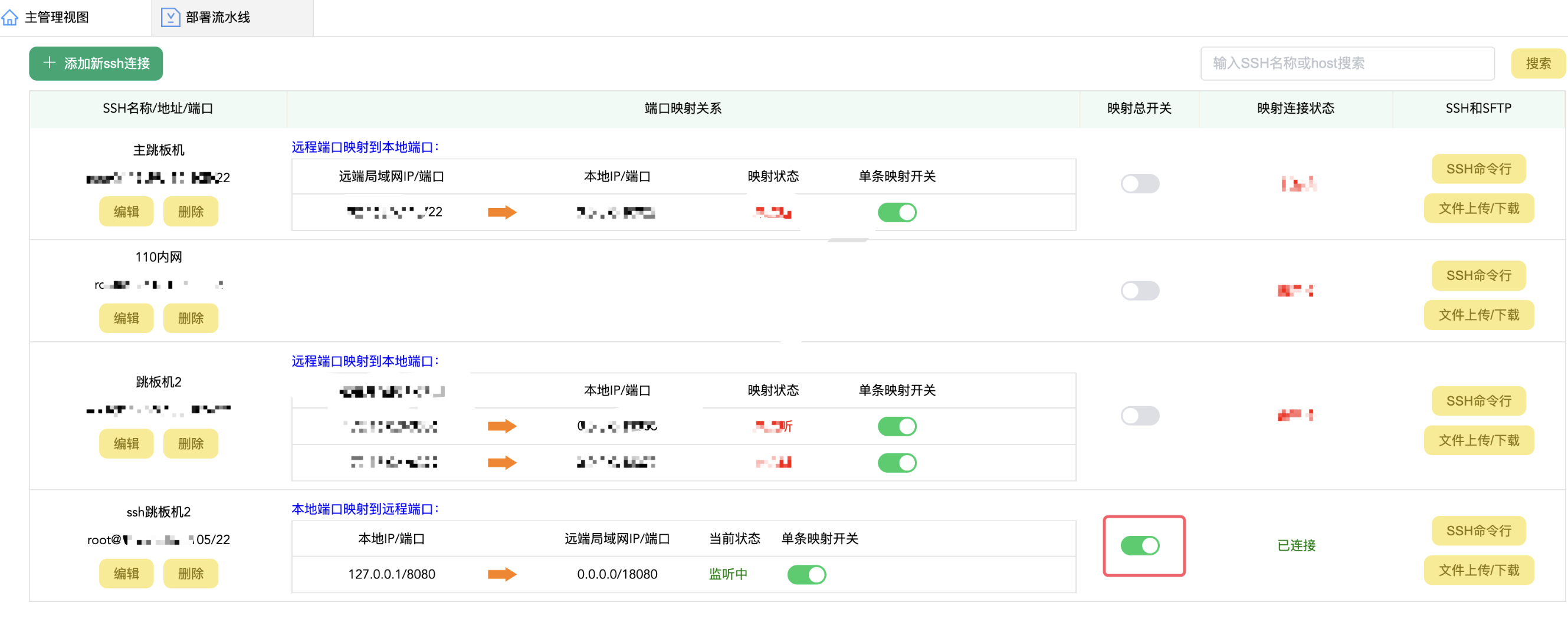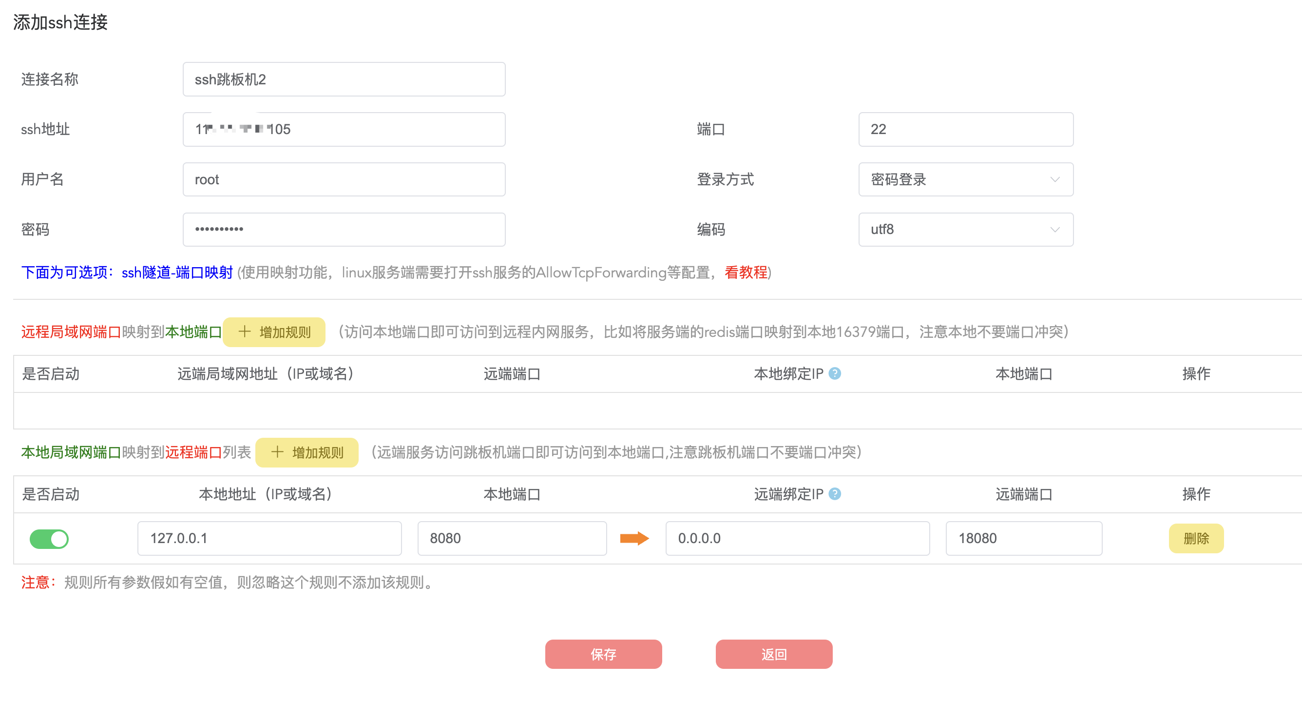 上面,创建一个ssh连接,然后在这个ssh连接下,创建一个映射规则,将本地的8080端口,映射到ssh跳板机的18080端口下。然后启用这个映射策略: