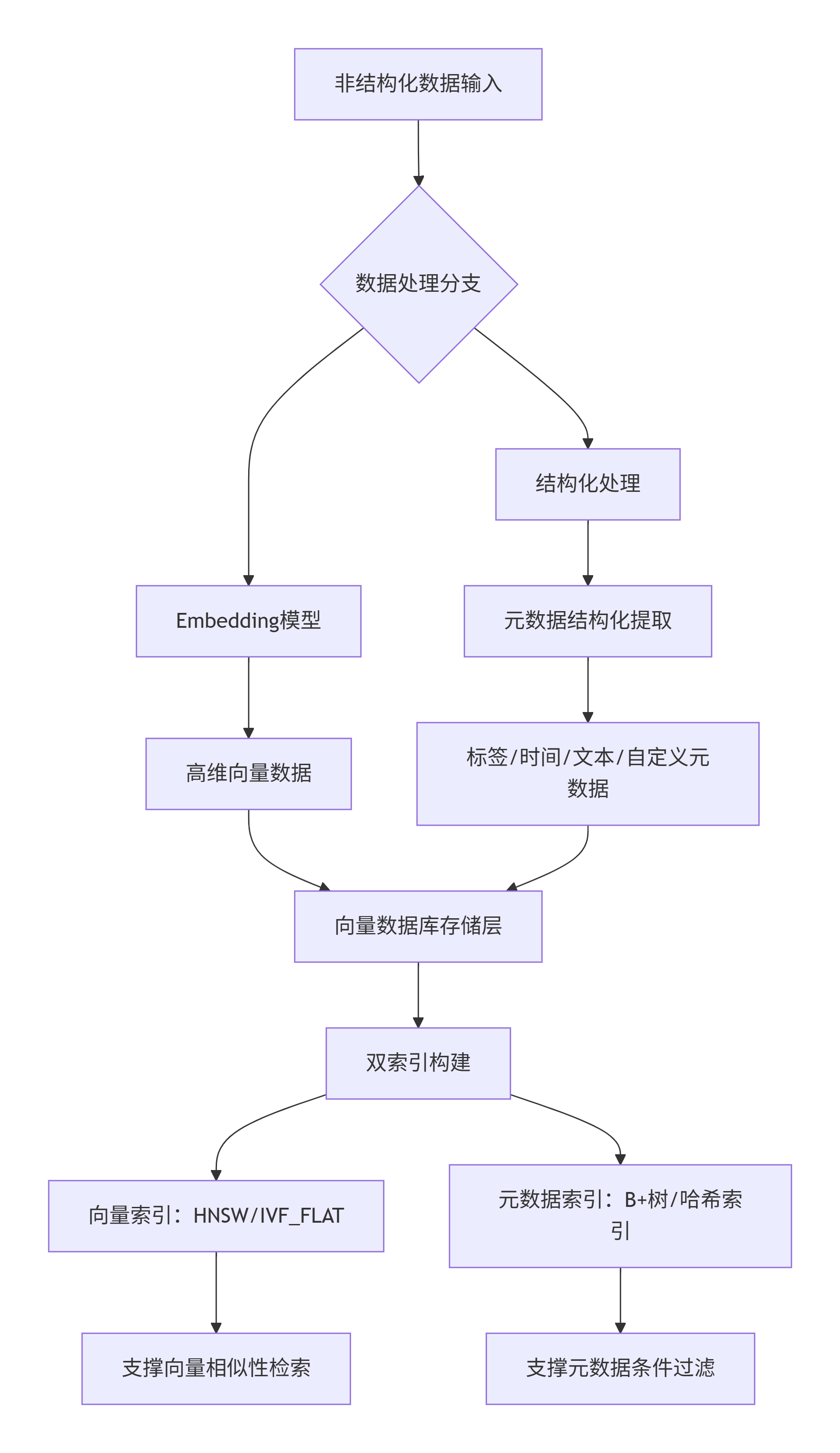 向量数据库需同时支撑向量数据的高效检索和元数据的快速过滤,主流采用“混合存储 + 双索引”架构,具体流程如下: