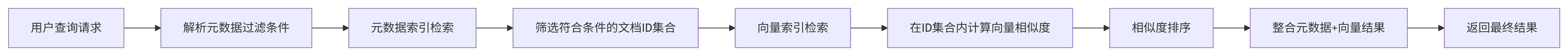 适用于元数据约束较宽松、需优先保证语义相似度的场景(如 “检索与‘RAG 技术原理’相似的文档,并排除 2023 年之前的内容”),执行流程如下: