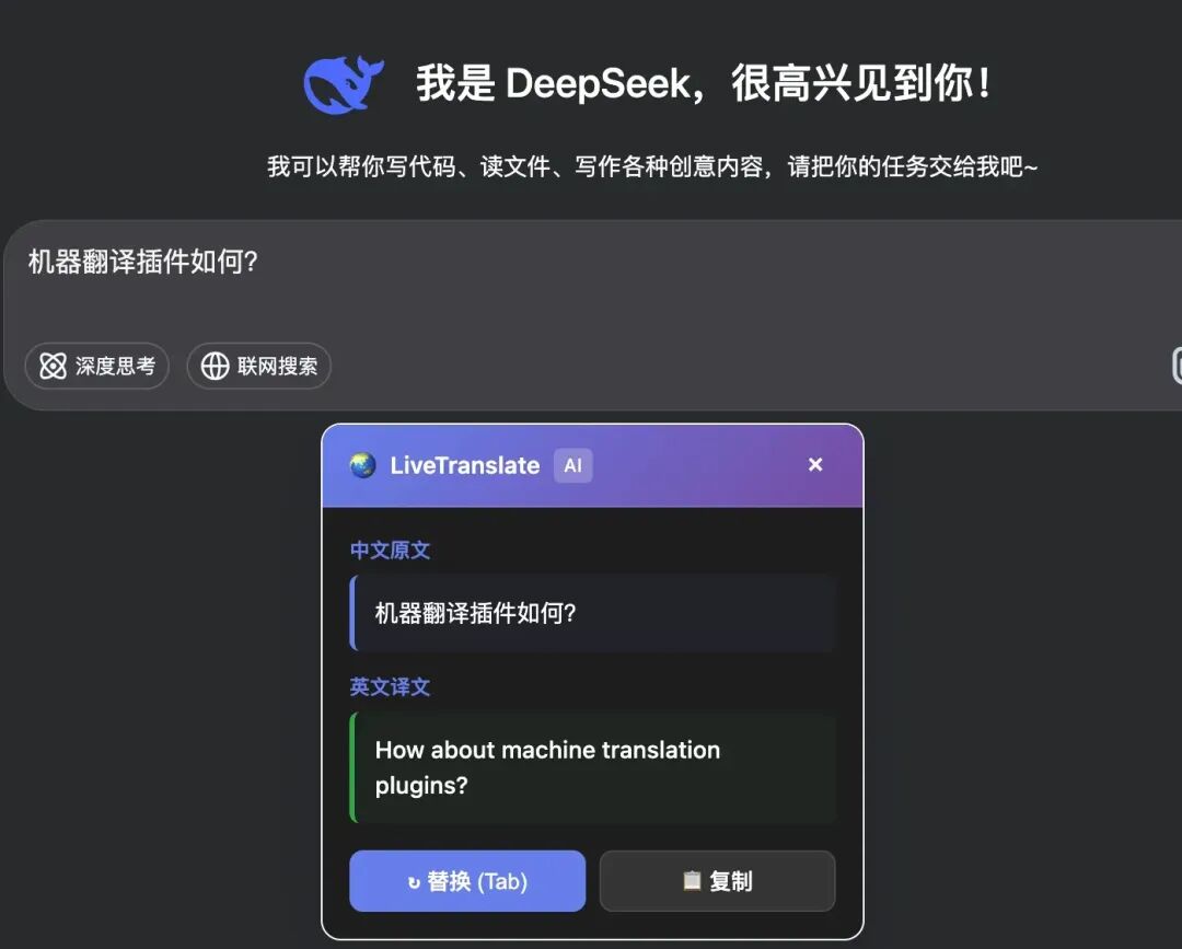 接着打开 https://chat.deepseek.com/ ,点击输入框,输入中文加个标点,英文就出现了,Tab替换立即中英切换!(第一次请求会卡一下,忍忍哈,后面优化)