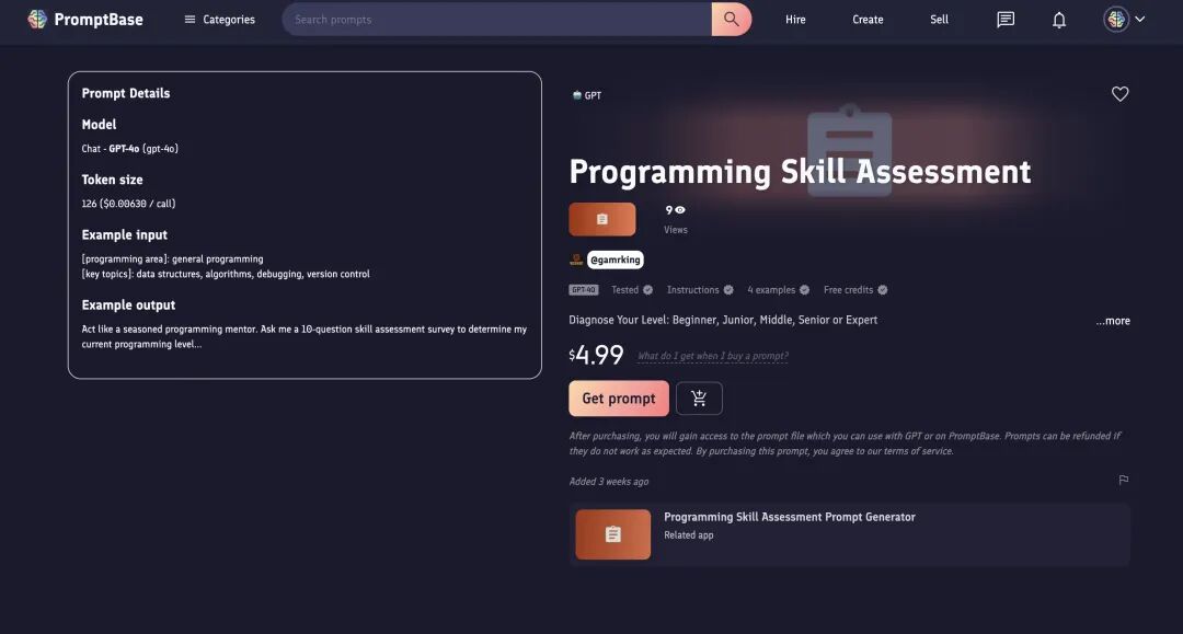 我对高效提示词管理的理解,它本质上是你与AI互动的有效经验沉淀,可以成为可复用、可迭代的知识资产,没错,不要把它仅仅当做是一个解决当前问题的利器,而是要想办法将其变为自己的知识资产。你要知道你要解决问题,很大可能也是别人会遇到的问题,如果你能通过迭代优化产出一份效果理想的提示词,那不仅可以在以后帮你快速解决重复或者类似的问题,甚至有可能成为一个商品在市场上流通,帮你赚真金白银!这不现在其实就有专门交易提示词的市场,有兴趣了解的可以搜一下 promptbase。就像下面一个关于编程的提示词售价4.99美金,太香了。