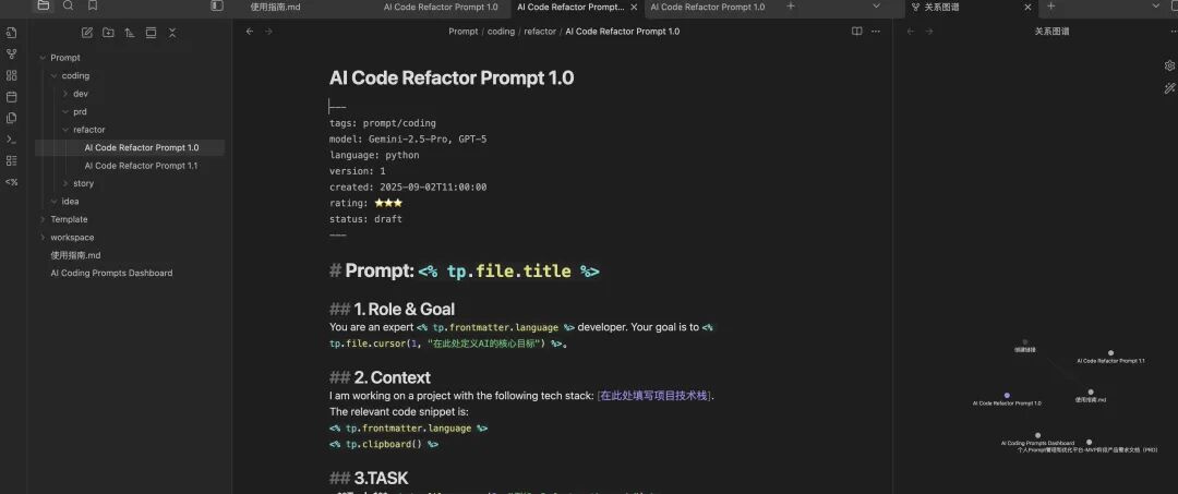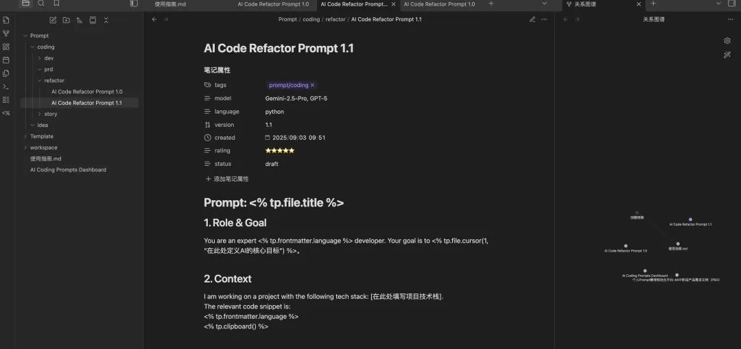 首先,你需要建立提示词的分类体系或者标签体系,我现在用的是Obsidian来建立自己提示词库。建议使用文件夹和标签来进行分类,并为每个提示词设置描述性名称和版本号,比如我编程提示词,就是放在Prompt/coding这个目录下,并且打上了prompt/coding/refactor的标签,命名为AI Code Refactor Prompt 1.0(AI重构代码命令提示词v1.0)