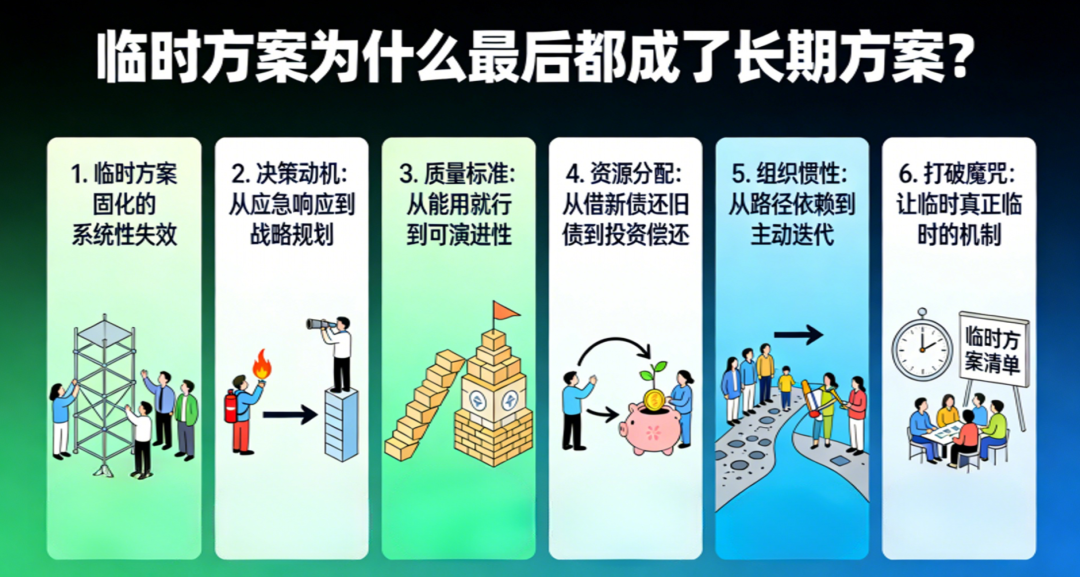 临时方案成为长期方案,不是偶然的失误,而是系统性问题的必然结果。它反映了我们在决策模式、质量标准、资源分配和组织机制上的缺陷。