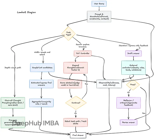 这些技术可以组合使用。CoT加SC是每次采样都用CoT然后多数投票。ToT加SC是ToT生成多个最终答案用SC选择。ToT加SR是用SR迭代改进ToT的最佳结果。复杂任务可能需要把多种技术串成流水线。