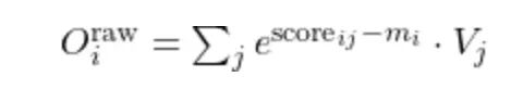 Softmax 涉及指数运算,FP16/BF16 下容易数值不稳定。为了把指数保持在合理范围,每个查询行追踪一个运行最大值 m_i。处理新的 K 和 V 块时,这个运行最大值可能增大。一旦增大,之前用旧最大值计算的累积贡献就不在同一尺度上了。