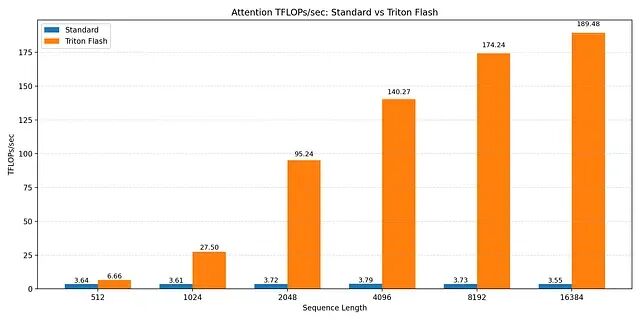 Triton FlashAttention 内核则随序列长度增加激进扩展。512 token 时性能一般,超过 2K token 后吞吐量快速上升。16K token 时维持在约 190 TFLOPs/sec。这正是 FlashAttention 设计要达到的效果:阻止注意力矩阵物化,中间数据驻留 SRAM,内存加载得以摊销。序列越长,内核越趋向计算受限,GPU 接近有效峰值吞吐量——和标准注意力恰好相反,标准注意力序列越长越内存受限。