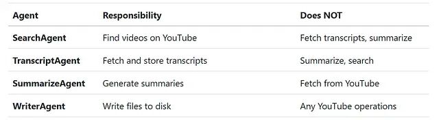 - **Chuds BBQ** — Temp-control + finishing approach多个 YouTube 视频的信息被综合成了一份连贯、可直接操作的参考文档。SearchAgent 找到对的视频,TranscriptAgent 拿到内容,SummarizeAgent 提炼关键信息,WriterAgent 保存结果。各司其职。