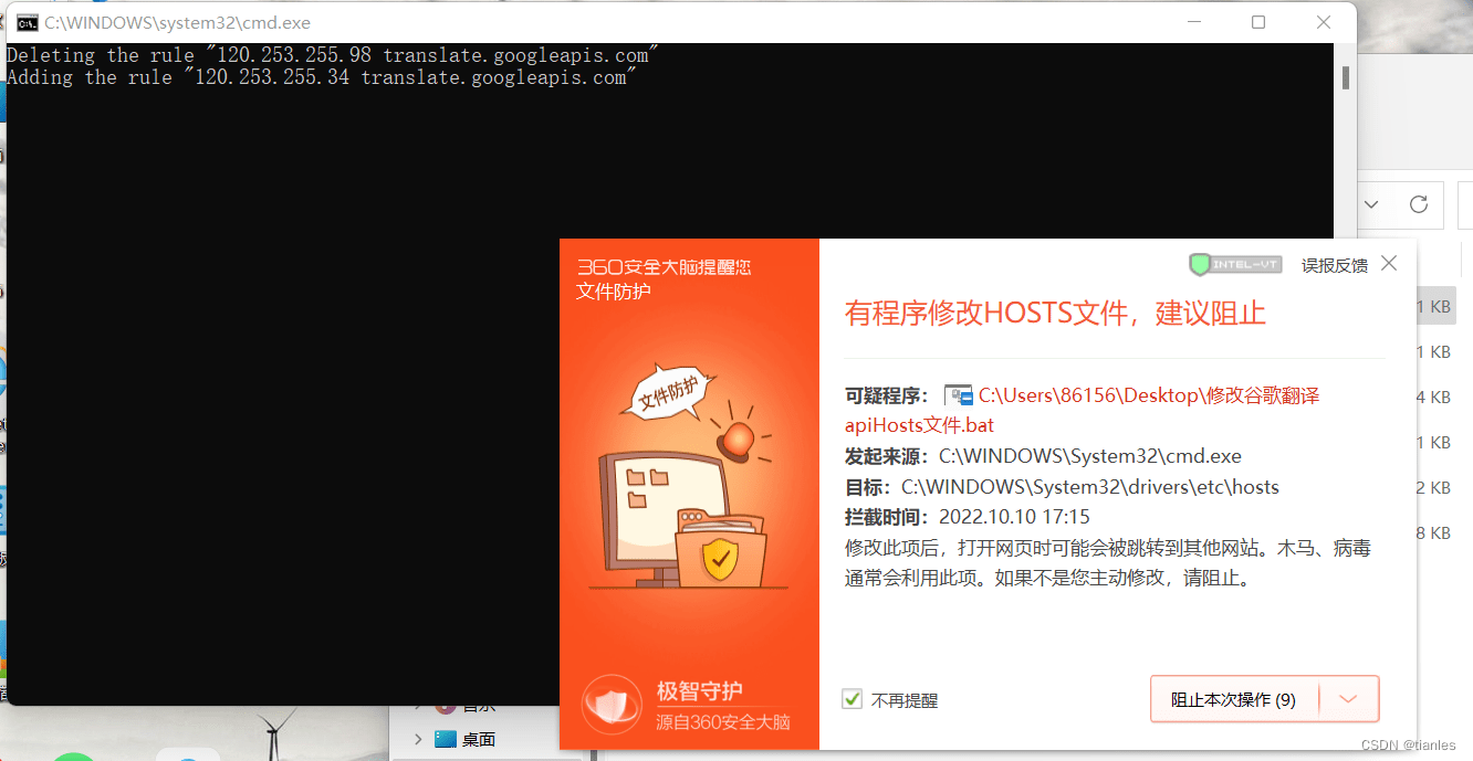 120.253.255.98为ip,translate.googleapis.com为Google翻译的api网址,ip可通过cmd命令行或在线网站ping来获得,例如: