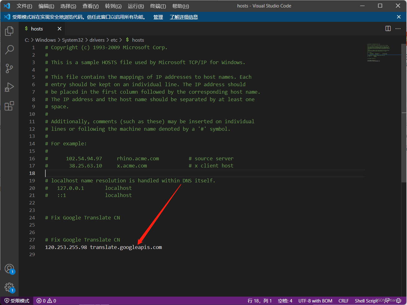 2.修改方法,把下方的内容复制到文本末尾(需要管理员权限修改):