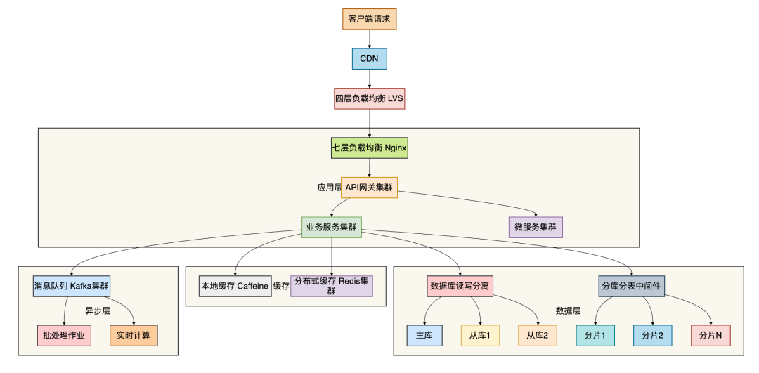 这个架构图展示了一个完整的千万级系统架构。