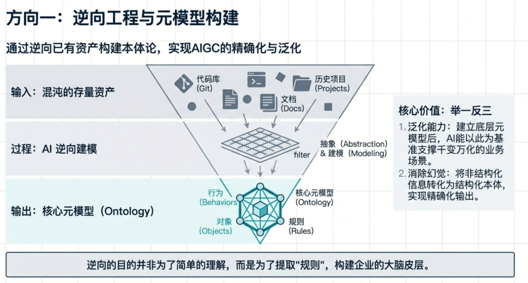这个逆向就是通过AI大模型的能力,对你已有的软件工程项目,包括类似于已有的知识库、方案文档,这些都可以进行逆向建模,形成底层核心的元模型。当然这个元模型本身可以参考本体论建模的思路,构建一个完整的对象、行为、规则融合的元模型。
