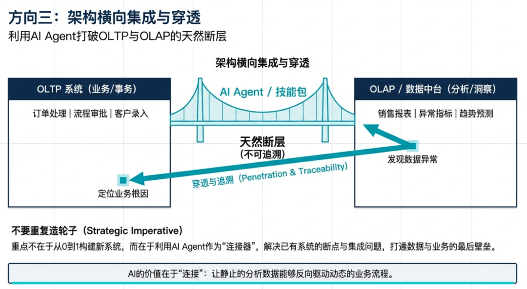 我还想做什么样的东西呢?就是通过AI大模型去实现你原有业务、原有流程或者是原有工作事项里面各种断点的集成打通或者是穿透。包括在前面我聊本体论的时候,我就聊到一个相当重要的东西,就是传统IT的建设它往往是OLTP和OLAP两大类的系统分开建设,这导致了这两类系统实现有天然的断层或者是断点。