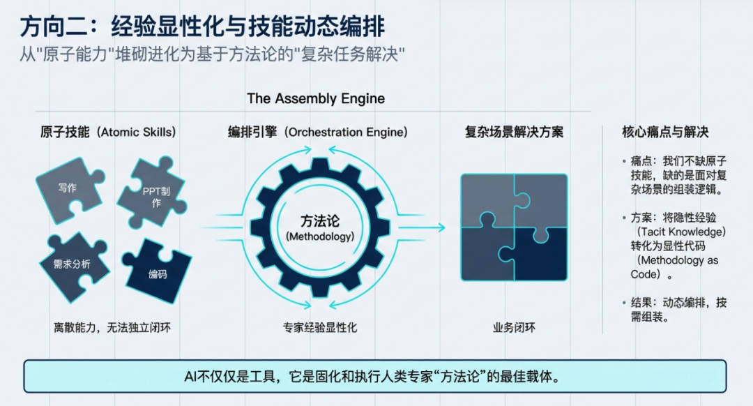 这个编排本身不是随意进行的,它是需要基于我们已有的很多经验、方法论的积累,按照一定的模式方法去做编排。所以说这个地方其实是相当有价值的,也就是我经常谈到的,你藏在自己脑袋里面已有的经验的显性化的一个过程。我们缺的从来都不是原子化的技能,而是涉及到面对不同的场景,你应该怎么样去组装编排技能的这么一个方法论。而这个方法论的技能本身它也是可以显性化的。这是我说的第二个关键点。
