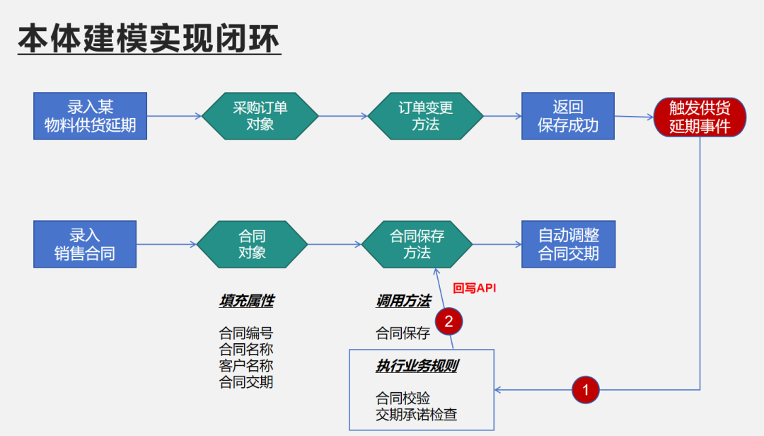 大家可以看到,当我去录入某个物料供货延期的时候,按传统业务功能的实现也是一样的。它会调用到采购订单对象,执行订单变更方法,然后返回保存成功。但是传统的业务功能做到这个地方以后,传统的业务功能实现就已经完成了。但是我们实际的本体论的模型,它实现关键的闭环这个动作没有完成。