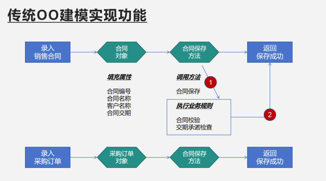 传统的OO建模,它更多的是为了OLTP或者是实现某一个业务功能而进行的建模。举一个简单的例子,比如说现在我已经实现了销售合同录入管理的功能。那么这个时候我录入一个销售合同的时候,它就一定会最终到合同对象上面来。合同对象就要去完成相关的属性的填充,然后合同对象去执行调用合同保存方法。合同保存方法里面,它又会去调用相关的执行的业务规则,类似于合同校验、交期承诺检查。在合同保存方法执行成功以后,它最终可能还返回给业务用户一个保存成功的结果。