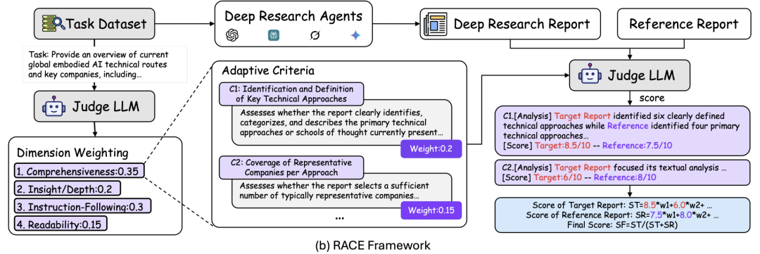 RACE是基于参考标准和自适应准则的动态加权评估框架,专门用于评估报告生成质量。该框架采用LLM-as-a-Judge方法。其首先动态生成针对特定任务的权重和评估标准,然后采用基于参考标准的评分方法,将待评估报告与高质量参考报告进行对比,最后计算相对分数来评估目标报告的质量,从而提供更具适应性和稳健性的评估。