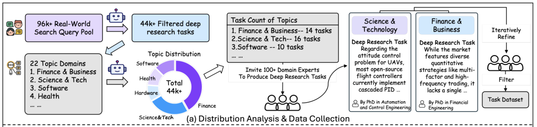 建立评估体系,评测集是第一步,以 DeepReaserch Bench 的数据收集和构建过程,提供思路。可先收集业务场景query,确定业务的主题意图分类体系,然后进行query的主题意图归类。