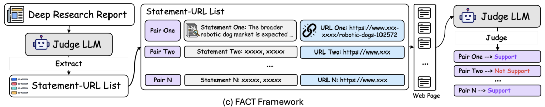 FACT是事实丰富性和引用可信性评估框架,专注于评估信息检索和引用准确性。聚焦报告事实丰富性与引用可信性,通过验证引用有效性、计算核心指标,评估报告信息检索和引用的准确性与实用性。
