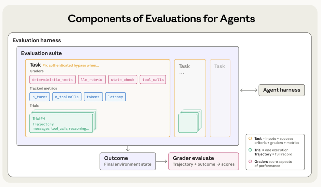 要根据实际的业务Agent进行组合和裁剪。Anthropic 建议:尽可能用确定性的评分器,必要时加LLM 评分器,人工评分器用来校准。
