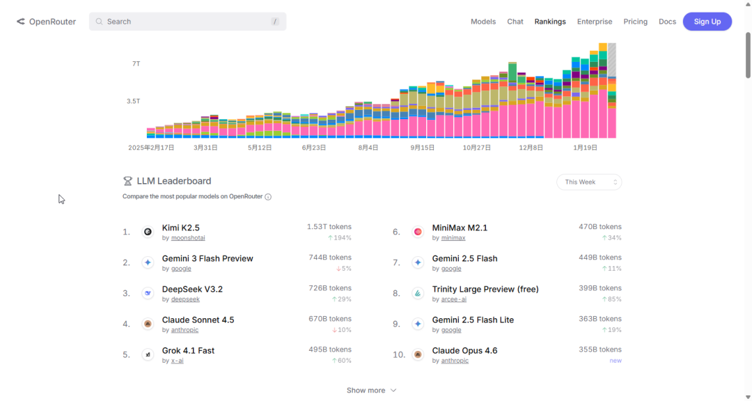 最近AI模型都在不断发布新版本,2月11日晚智谱新模型GLM-5发布,网传DeepSeek将在今年2月中旬农历新年期间推出新一代旗舰AI模型DeepSeek V4,MiniMaxM2.5模型也即将正式上线,真是百花齐放,都用不过来了!直接看下模型以及工具排行榜