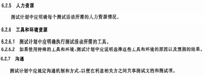 规定了测试计划中应对每个测试活动所需的人力资源情况进行明确。如测试环境搭建活动,需要系统工程师、DBA、软件系统实施人数等。