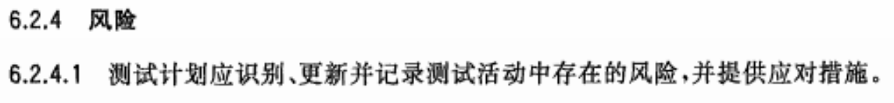 6.2.4.1 测试计划应对测试工作进行风险分析与评估,对各种风险提出应对措施,且在测试过程中持续的进行风险识别、分析,并更新记录到测试计划中。