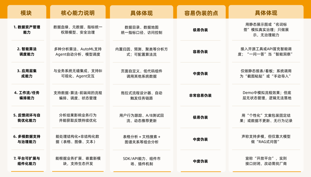 为了帮助用户辨别真假平台,我们需要搞清楚数据智能平台的核心能力是什么,以及哪些是容易被“包装”的点。为此,我们做了下面这张表: