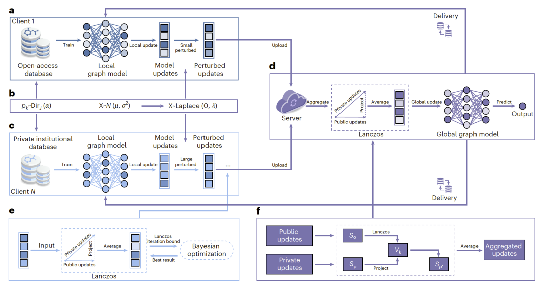 在分子发现领域,数据往往分散在不同机构和企业之间,由于隐私保护、知识产权和数据安全等限制,难以实现数据共享,从而制约了机器学习模型性能的提升。为解决这一问题,研究人员提出了一种面向分子发现的联邦图学习方法,使多个数据持有方能够在不共享原始数据的前提下协同训练高性能模型。该方法将图神经网络与联邦学习框架相结合,在保护数据隐私的同时实现跨机构知识整合。实验结果表明,该方法在多种分子性质预测与虚拟筛选任务中显著优于单方训练模型,并接近集中式数据训练的性能水平,为多方协作的智能分子研发提供了可行路径。