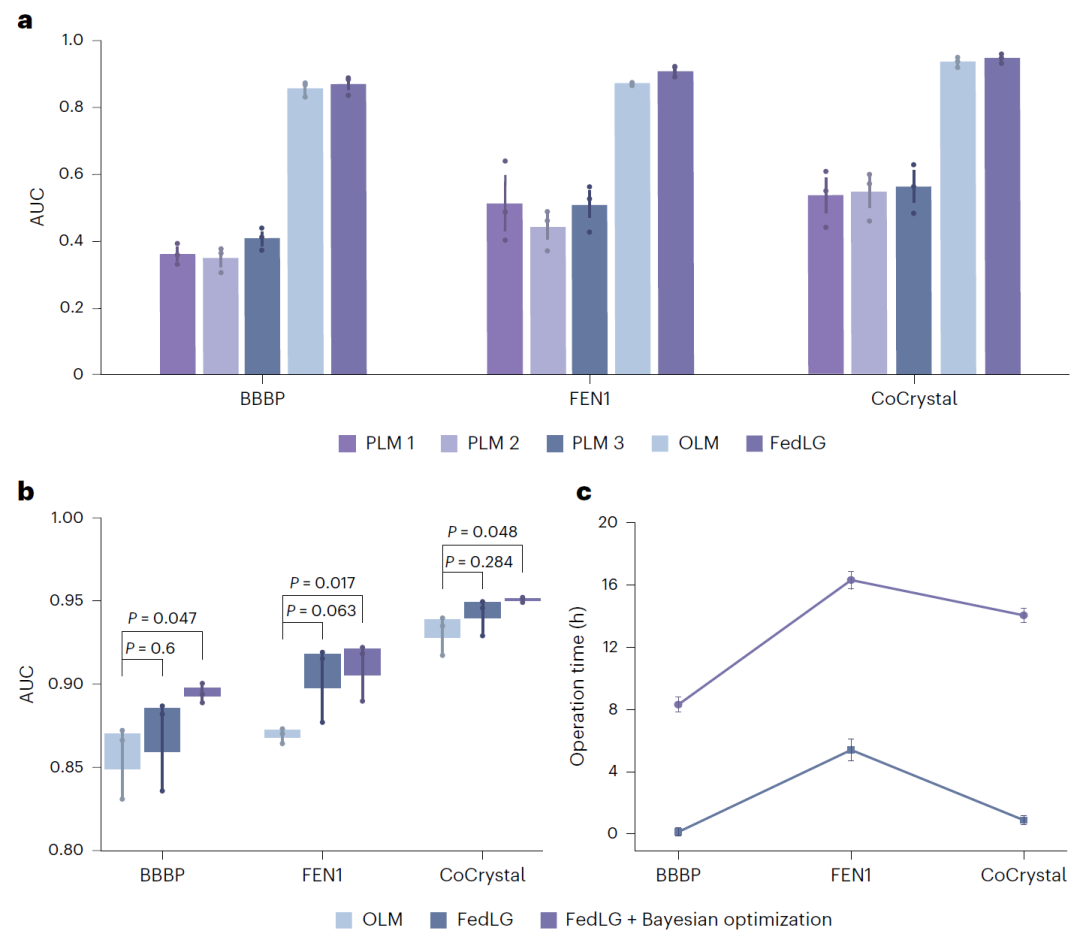 图3:联邦图学习与单方模型及集中式模型在分子性质预测上的性能对比。