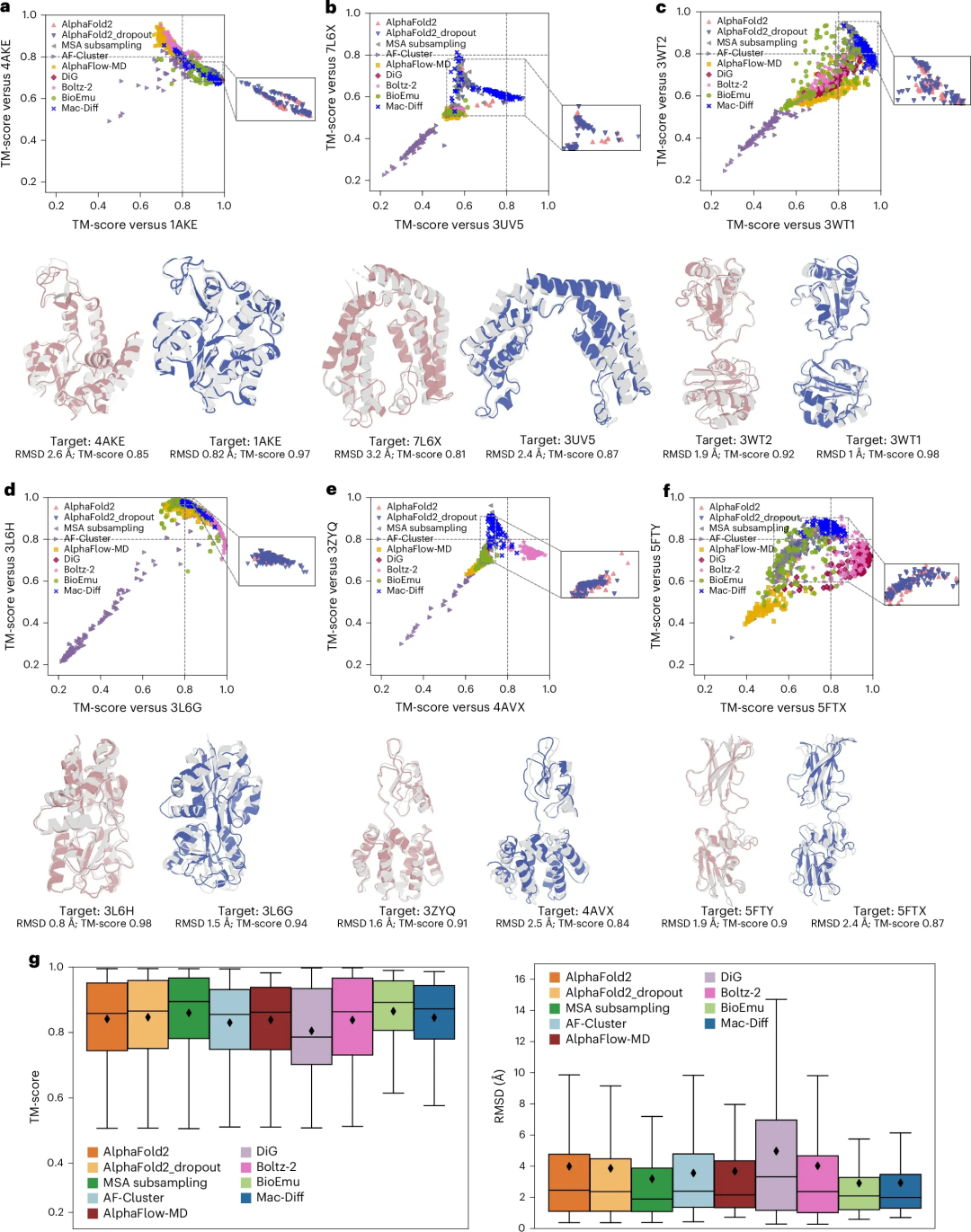 图6 Mac-Diff和8种对比方法在变构蛋白AdK及Cfold40测试集中代表案例上的表现。(a-f) 模型在Adk、TAF1的串联溴结构域、PDI的的b’–a’域、OpuA的底物结合域、HGS-Hrs的串联VHS和FYVE结构域及表面层蛋白上性能。(g) 9种方法的TM-score和RMSD分布[1]
