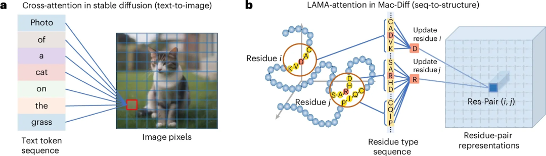 为直观阐明LAMA-Attention的设计精髓,作者对比了其与经典的文生图模型的差异(图2)。传统的交叉注意力机制在像素和词语间建立全局密集的链接,缺乏明确的结构化对应(图2a)。相比之下,Mac-Diff紧密围绕蛋白质特有的生物学属性,对蛋白质不同模态之间的信息交互机制进行了更加深度的适配,通过物理先验实现了注意力的“去冗存精”。模型通过将注意力场精准聚焦于残基的局部相互作用邻域,仅聚合生物学上存在交互的残基特征。这种位置感知的空间对齐策略,确保了序列信息向结构空间的高效注入,显著提升了模型对蛋白质局部动态的捕捉能力。