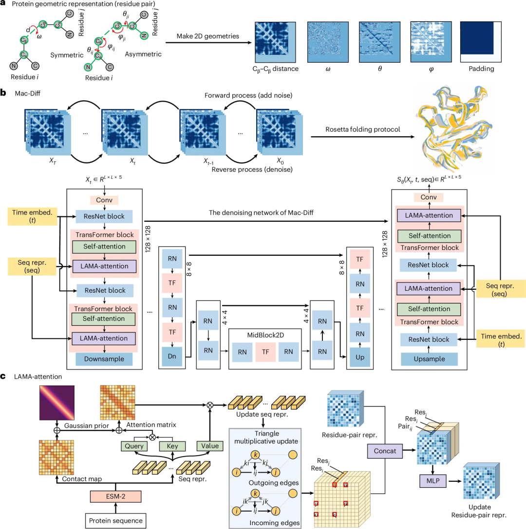 图1 Mac-Diff模型架构。(a) 蛋白质的几何表示。(b) UNet去噪网络。(c) 局部感知的模态对齐注意力模块[1]