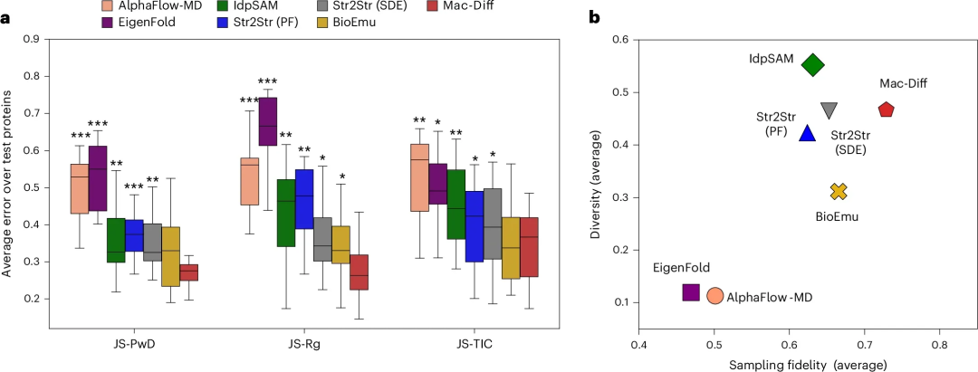 作者将Mac-Diff在由12个快速折叠蛋白MD轨迹构成的测试集上进行综合评估。结果表明,与6个先进方法相比,Mac-Diff在JS-PwD、JS-Rg、JS-TIC等多个衡量分布差异的关键指标上展现出色的性能(图3a)。同时,Mac-Diff有效兼顾了生成样本的多样性-保真度性能(图3b)。在2D-TIC空间及残基对接触概率的表现进一步表明Mac-Diff能够生成高度逼真的构象分布(图4)。