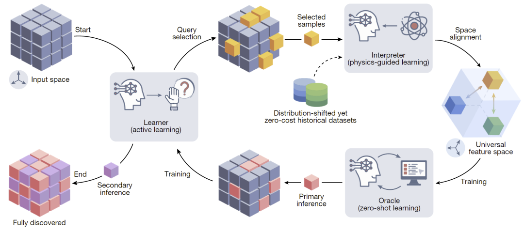 为解决上述问题,研究人员借鉴教育心理学中的发现学习理论,提出通过类似人类推理的方式,将历史知识转化为新问题的预测能力。发现式学习由三个协同模块构成:学习者负责通过主动学习从未标注的新电池设计中选择最具信息量的样本;解释器基于物理引导学习,将早期循环数据映射到统一且可解释的物理特征空间,以缩小历史电池与新设计之间的差异;预言机则在不依赖新寿命实验的情况下,仅利用历史数据进行零样本预测,并生成寿命“伪标签”供学习者进一步优化推理过程。三者形成一个不断迭代的闭环系统,使模型能够在极低实验成本下逐步提高预测精度。