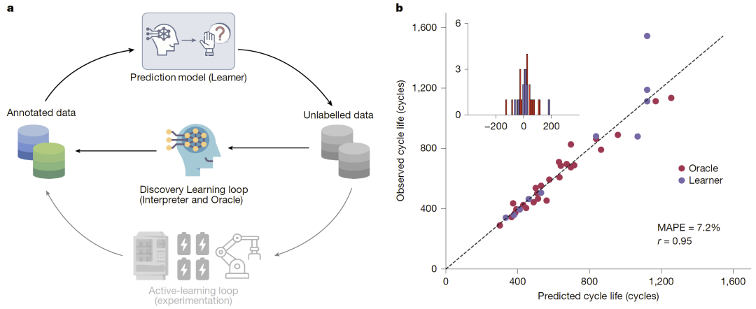 研究人员提出了一种名为发现式学习(Discovery Learning)的科学机器学习框架,将主动学习、物理引导学习与零样本学习整合进类似人类推理的闭环流程中。该方法能够利用历史电池数据,在极少实验条件下预测新型电池设计的循环寿命。在包含123个工业级大容量锂离子软包电池的数据集上,发现式学习仅利用部分电池前50个循环的信息,即可实现约7.2%的寿命预测误差,同时在时间与能耗成本上分别节省约98%与95%。该方法为高效电池寿命评估提供了新路径,也为AI加速科学发现展示了重要潜力。