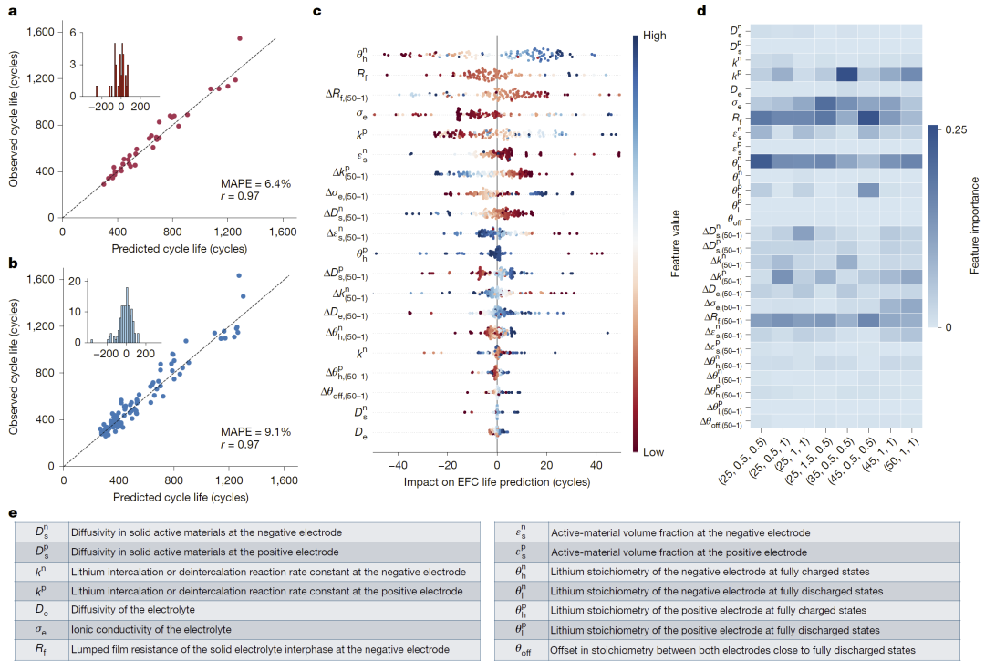 在不引入主动学习反馈的情况下,研究人员首先评估了解释器与预言机构成的开放环预测能力。结果显示,该模型在电池组平均寿命预测上的误差约为6.4%,在单电池层面误差约为9.1%,预测值与真实寿命之间具有极高相关性。进一步的可解释分析表明,早期循环阶段的一系列物理特征,如活性材料体积分数、锂化学计量状态变化以及界面膜阻抗演化等,对寿命预测起到了关键作用,而且这些特征的重要性会随温度和倍率条件发生变化,与已知的电池退化机理高度一致。这说明发现式学习不仅具有较高精度,也具备良好的物理合理性。