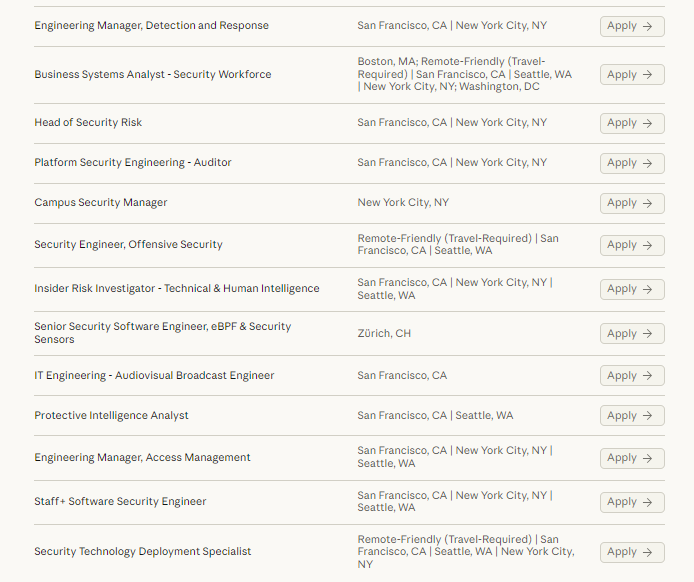 于是乎,接下来一定要做的,当然是打开Anthropic的招聘页面看对于“Security”领域的人才需求,发现有32个职位,在Anthropic的15个正在招聘的teams中的需求量居第5位。虽然最后这32个职位的人员不一定都开发安全领域,但也许只有懂安全的人才能做出好的安全工具。