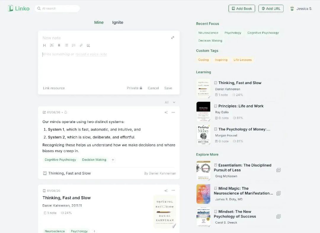 这是 Linko 最让人惊艳的地方。 当你写下关于“注意力机制”的新笔记时,Linko 会在后台轻声提醒:“嘿,这和你三个月前存的那篇关于‘心流状态’的文章有深层联系。” 这种跨越时空的灵感碰撞,是传统文件夹式管理永远无法给你的“惊喜感”。