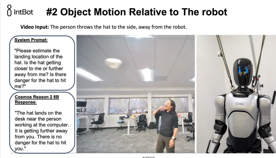 空间推理能力在多人场景中尤为重要。当周围站着多个人时,Cosmos Reason能够估算每个人的相对位置和距离,识别出谁离机器人最近,从而帮助机器人做出注意力分配的决策。