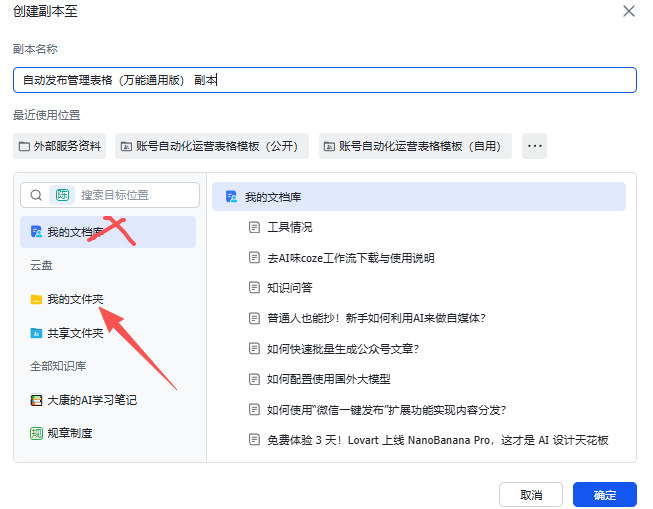 ⚠️ 这里有个坑,请注意! 创建副本时,系统默认可能会选“我的文档库”。请千万不要选这个! 一定要选择保存到“云文档”下的某个文件夹里。否则接口可能无法读取。
