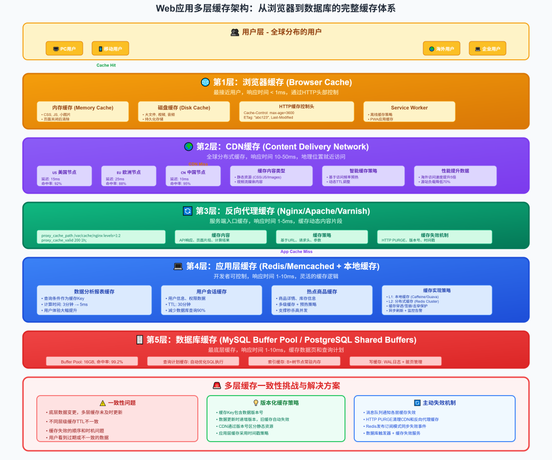 在Web应用中,缓存往往是分层的。从用户的角度看,一个请求可能会经过浏览器缓存、CDN缓存、反向代理缓存、应用层缓存、数据库缓存等多个层次。