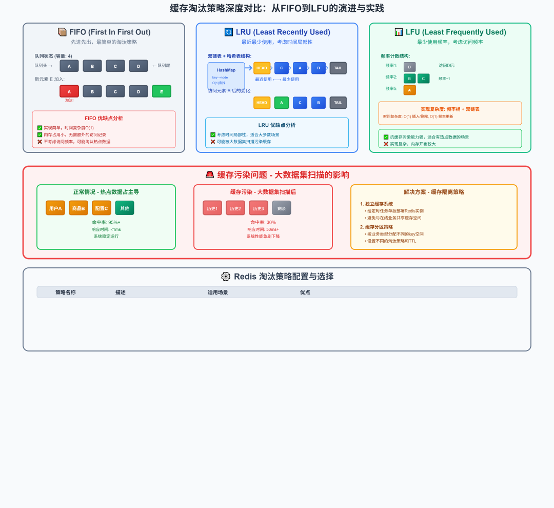 但是这里面的学问可大了去了。比如说,你的抽屉总共就那么大,新东西要往里放的时候,旧的东西怎么办?先进先出?还是把最不常用的扔掉?这就涉及到缓存的淘汰策略了。