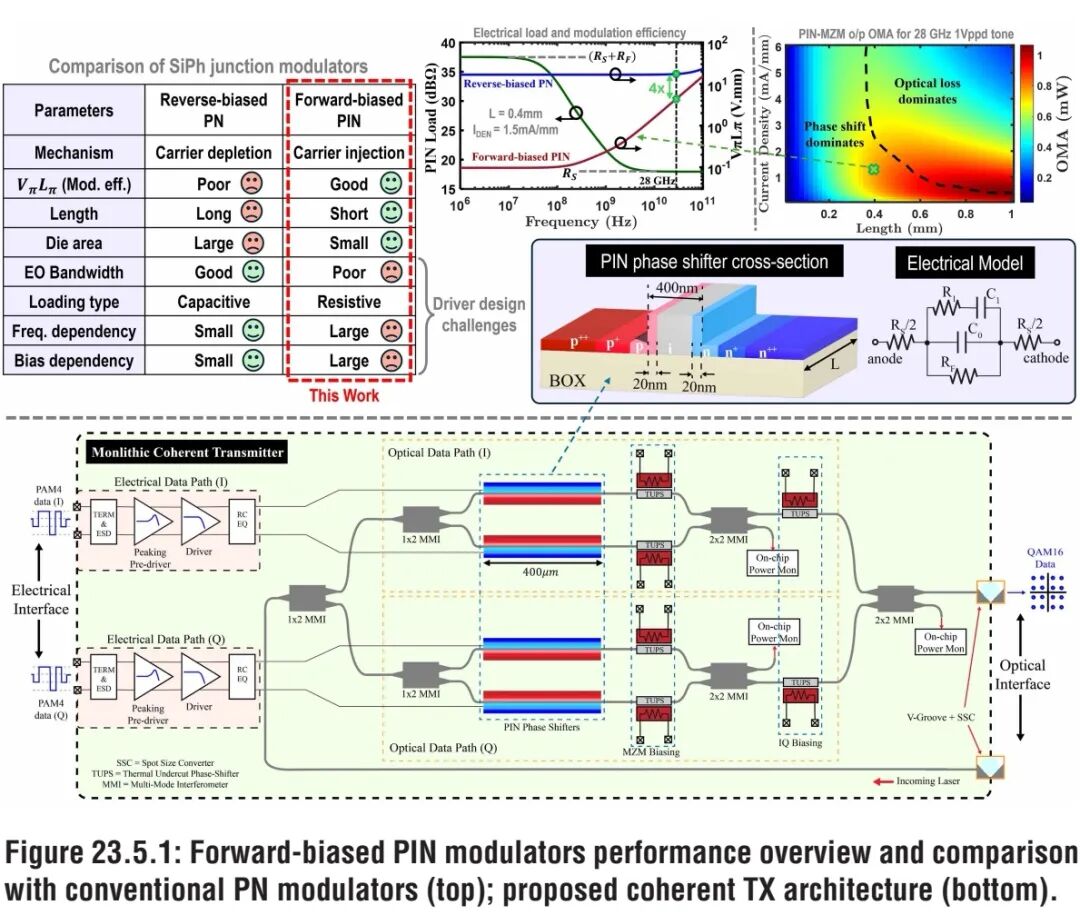 ◆ 器件架构与设计 ① 整体发射机架构 图23.5.1为本文提出的相干光发射机架构框图。入射激光被等分为两路,分别送入同相(I)、正交(Q)支路的MZM;每路MZM中,PIN相位移相器完成入射光的调制,低功耗掏空热光移相器(TUPS)用于将MZM的偏置点调至相干传输所需的零点,或IMDD传输所需的正交点。此外,额外配置的TUPS用于调节I、Q支路间的相对相移,满足相干传输的相位匹配要求。片上光功率监测器可实时检测光功率,为所有TUPS提供精准的偏置电压调节依据。host串行解串器(SerDes)生成的高速电数据,驱动单片集成的多级线性电驱动器,以推挽方式为MZM提供驱动信号。 图23.5.1同时给出了正偏PIN相位移相器的物理横截面与简化电模型。低频下,其等效负载阻抗为接触电阻R_S与正偏二极管电阻R_F的串联结构;高频下,负载阻抗由接触电阻R_S主导。器件的寄生参数、VπL与光损耗,均与正偏电流密度I_{DEN}强相关:随着I_{DEN}与移相器长度的增加,相移量提升,但光损耗同步增大。