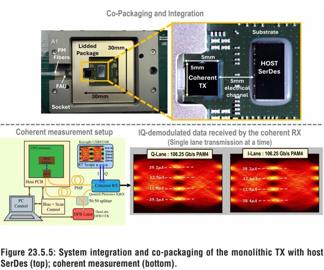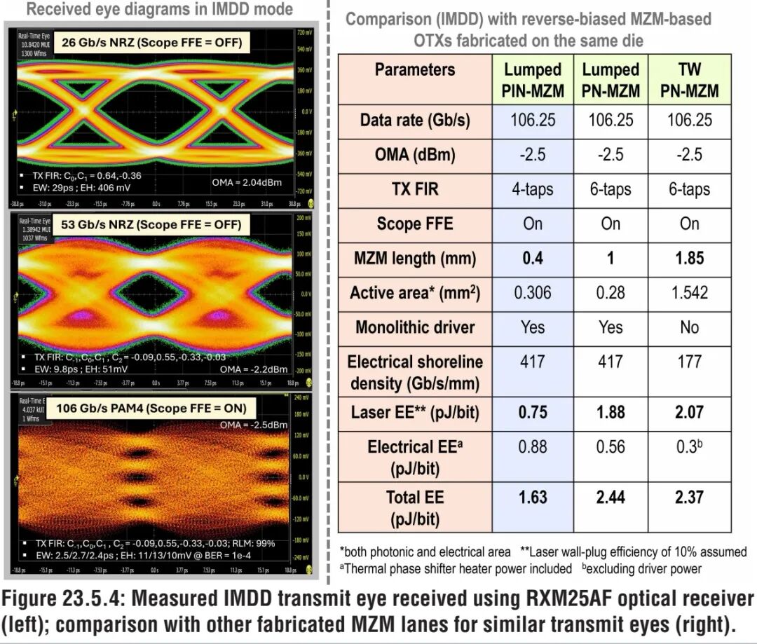 相干模式下,同一时间仅传输单路(I或Q)数据,采用UXR0334B实时示波器直接测量无源相干接收器的输出电流。由于接收端未集成载波相位恢复与相位跟踪环路,接收数据的长期稳定性不足,本文对采集的实时数据进行后处理,得到了包含10.6k单位间隔(UI)的眼图(图23.5.5),测试采用的TX-FIR与示波器FFE配置,与106.25Gb/s IMDD PAM-4测试一致。 为对比性能,本文在同一晶圆上同步流片了集总式PN-MZM与行波式PN-MZM光发射机,测试结果如图23.5.4所示:在106.25Gb/s速率下实现相同发射OMA的前提下,得益于PIN-MZM的高调制效率,其激光功耗较集总式PN-MZM降低2.5倍,较行波式PN-MZM降低2.76倍;PIN-MZM发射支路的总能量效率(电学+激光)为1.63pJ/b,较PN-MZM提升1.5倍,较传统行波式PN-MZM提升1.45倍;同时,因省去了传输线结构,其管芯面积较行波式PN-MZM缩减5倍。