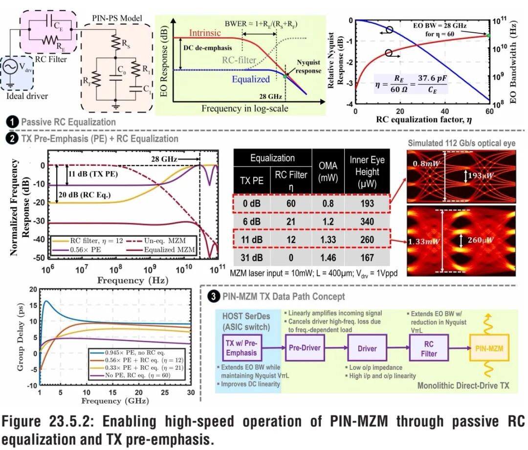 本设计选取移相器长度0.4mm、I_{DEN}=1.5mA/mm,此时光损耗仅0.6dB,在实现器件紧凑化的同时,保证了足够的光调制幅度(OMA)。尽管高频下大扩散电容(C_{0.1}>20pF/mm)会导致Vπ L恶化、电光带宽下降,但即便在极高频段,其调制效率仍优于传统反偏PN结相位移相器。 ② 带宽扩展与均衡方案 光发射机的电数据通路设计,核心目标是对PIN-MZM的固有电光响应进行均衡补偿,同时保留其高调制效率的优势。图23.5.2总结了本设计采用的技术方案:将PIN相位移相器与无源RC高通滤波器级联,实现低频分量的去加重;通过合理匹配电阻R_E与电容C_E的参数,可获得平坦的电光响应,并拓展器件带宽。