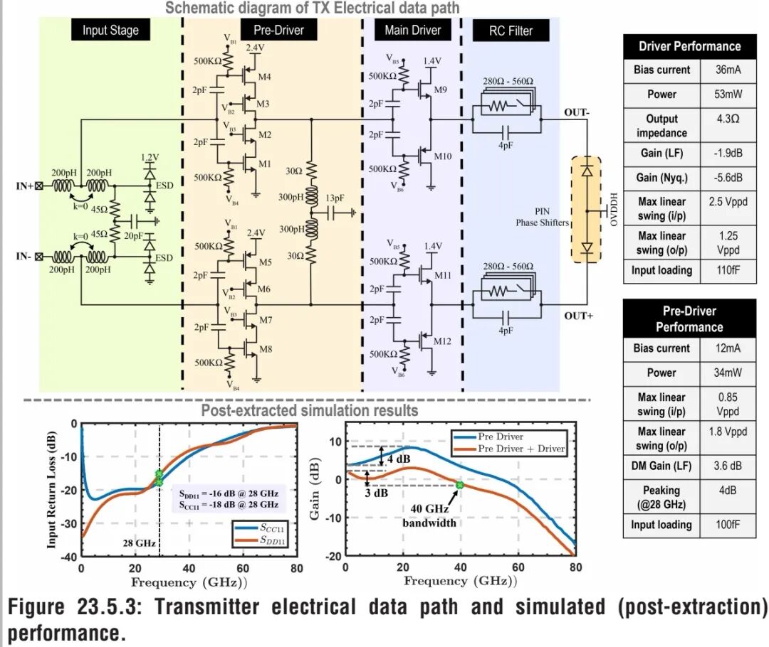 对于0.4mm长、偏置电流0.6mA的PIN相位移相器,当R_E=600Ω、C_E=3.76pF时,可实现4.5GHz的平坦电光响应带宽;保持R_E C_E乘积不变,同步缩放电阻、电容参数,可在维持电光响应平坦度的同时,灵活调节带宽。当R_E=3.6kΩ、C_E=627fF时,器件有效电光带宽可达28GHz,完成对PIN-MZM固有电光响应的完全均衡。 但强RC均衡会导致奈奎斯特频率(112Gb/s PAM-4传输对应奈奎斯特频率为28GHz)处的电光响应衰减,进而恶化有效VπL。而发射端预加重(PE)或TX-FIR技术,可在拓展带宽的同时,保证奈奎斯特频率处的增益为1。将发射端预加重与RC均衡器结合,可恢复器件的有效VπL;但过度的发射端预加重会增大小群时延波动,并在通带内产生纹波。如图23.5.2所示,将0.56倍的发射端预加重(后游标抽头)与20dB的RC均衡相结合,相较纯RC均衡方案,发射OMA提升了1.6倍。 ③ 电驱动器与数据通路设计 图23.5.3为光发射机的电数据通路架构,由RC均衡器、两级线性驱动器与无源输入级构成。可调RC滤波器可实现20dB的标称均衡,且能适配工艺偏差带来的参数波动。经RC均衡后的PIN-MZM,等效负载阻抗从低频的635Ω降至高频的8Ω,因此需设计低输出阻抗的驱动器;本设计采用互补源极跟随器结构实现主驱动器,该结构不仅输出阻抗低,还具备极高的输入、输出线性度,且互补拓扑可显著降低偏置电流需求。