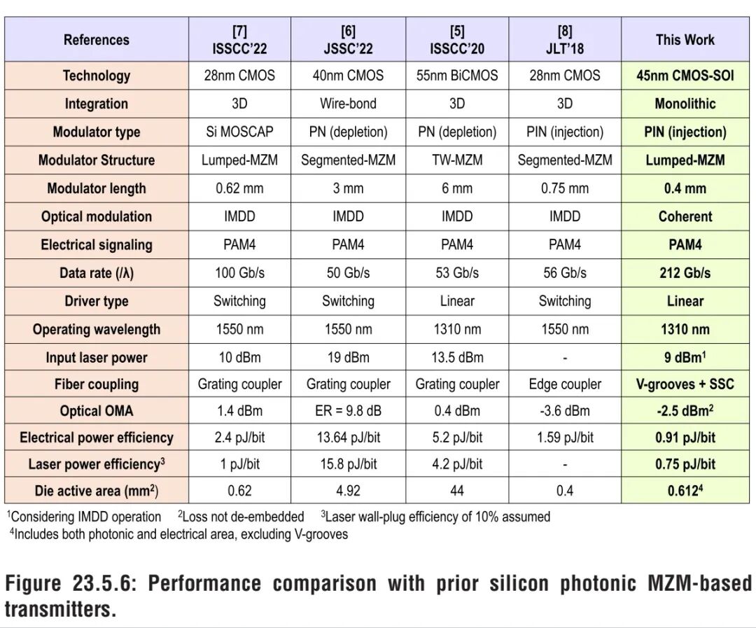 图23.5.6为该光发射机与已报道的硅基光子MZM光发射机的性能对比。本工作实现了O波段最短的MZM器件,电能量效率低至0.91pJ/b,为当前业界最优水平;同时,相干传输技术使单波长数据速率翻倍,为下一代高带宽密度、高能效光互连技术奠定了基础。