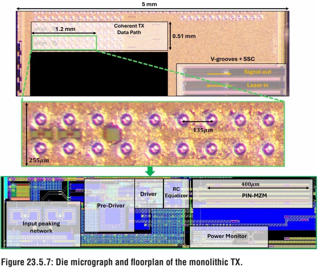 为补偿源极跟随器的固有增益损耗(-1.9dB),以及MZM负载特性导致的高频损耗(-3.7dB),本设计增设了预驱动器级。预驱动器采用无尾电流源的互补电流模逻辑(CML)拓扑,与主驱动器间采用交流耦合;其采用更高的电源电压,并引入共源共栅器件,保证了高输出线性度。此外,预驱动器通过30Ω无源电阻设定直流增益,搭配300pH并联峰化电感,实现了4dB的高频峰化,有效拓展了带宽。 最终设计的两级驱动器,电带宽达40GHz,以总谐波失真(THD)-30dB为判定标准,最大线性摆幅为1.15V。输入级集成200pH电感,可有效解耦预驱动器、铜柱凸点及静电放电(ESD)二极管引入的负载电容,将输入带宽拓展至65GHz,同时实现优异的输入回波损耗(差分模式S_{DD11}=-16dB,共模S_{CC11}=-18dB)。 ◆ 测试与性能验证 ① 芯片实现与测试平台 本文提出的单片集成相干收发器,核心为自主设计的0.4mm长PIN-MZM,基于GlobalFoundries 45nm CMOS-SOI工艺(45SPCLO)流片实现。相干发射机核心(含电学与光子学器件)的芯片面积仅0.612mm²(图23.5.7);采用氮化硅(SiN)V型槽边缘耦合器与模斑转换器(SSC)实现光信号的片上耦合,采用间距135μm的铜柱凸点阵列实现电信号互连。该单片芯片通过倒装焊工艺键合至有机基板,并与作为高速数据发生器的主机SerDes芯片共封装(图23.5.5)。1310nm分布反馈式(DFB)激光器产生的激光,经4m长保偏光纤耦合至芯片内部。