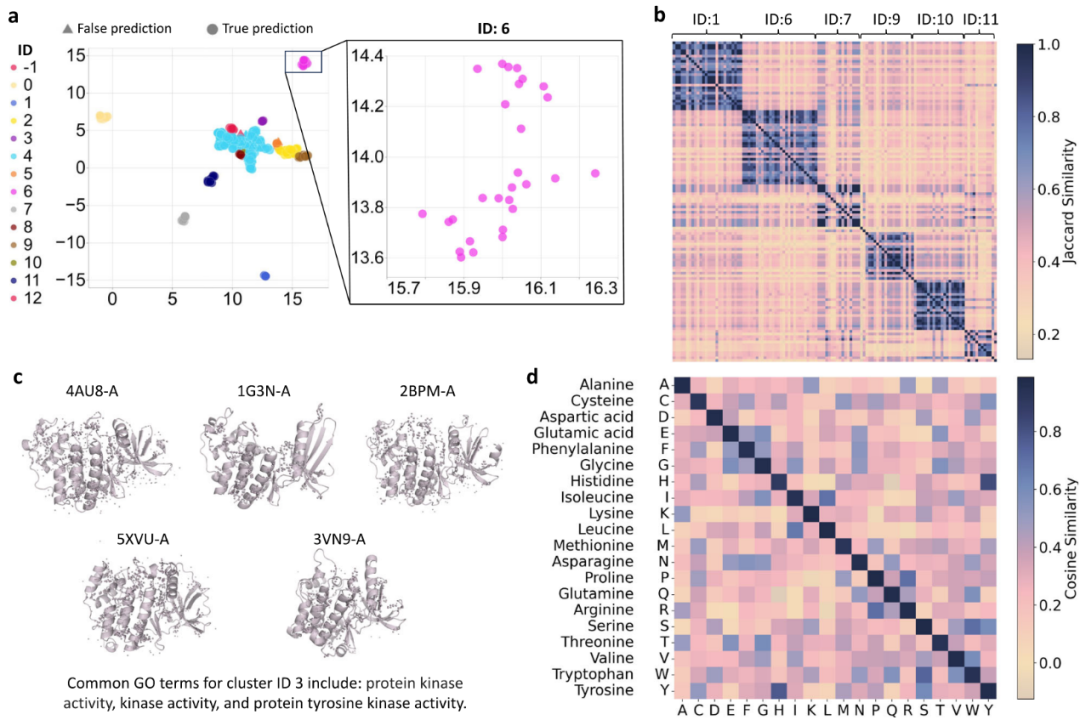 使用UMAP将MotiL学习到的ATP结合蛋白表示投影到二维坐标空间(图3a)。随后应用基于密度的空间聚类算法DBSCAN识别并可视化各个蛋白的聚类ID。接下来,绘制了分子功能相关GO术语的Jaccard相似度热图,分析对象为包含10–40个蛋白的簇。图3b结果显示,簇内相似度普遍较高,簇间相似度相对较低。这表明,每个蛋白学习到的表示与其分子功能保持一致。随后,聚焦具体案例考察蛋白质的三维结构。图3c结果显示,在第3簇中,蛋白4AU8-A、1G3N-A、2BPM-A、5XVU-A和3VN9-A在结构上彼此高度相似。此外,这些同簇蛋白还共享GO注释,例如蛋白激酶活性。最后,计算了20种氨基酸表示之间的相似度,并以热图形式展示。由图3d可知,相同氨基酸在不同编码器下表示高度相似,不同氨基酸之间相似度较低。此外,MotiL能够准确识别具有相似芳香环结构的分子(高度相似),结构异构体(相似),侧链结构差异较大的分子(不相似)。